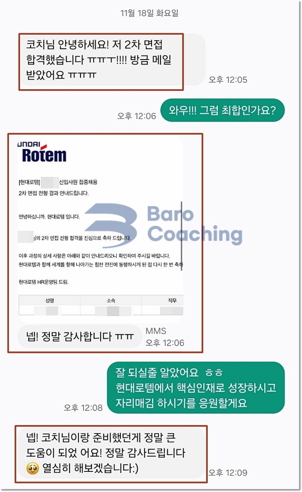 바로코칭을 통해 합격한 수강생들의 실제 문자/카톡 후기를 모았습니다.