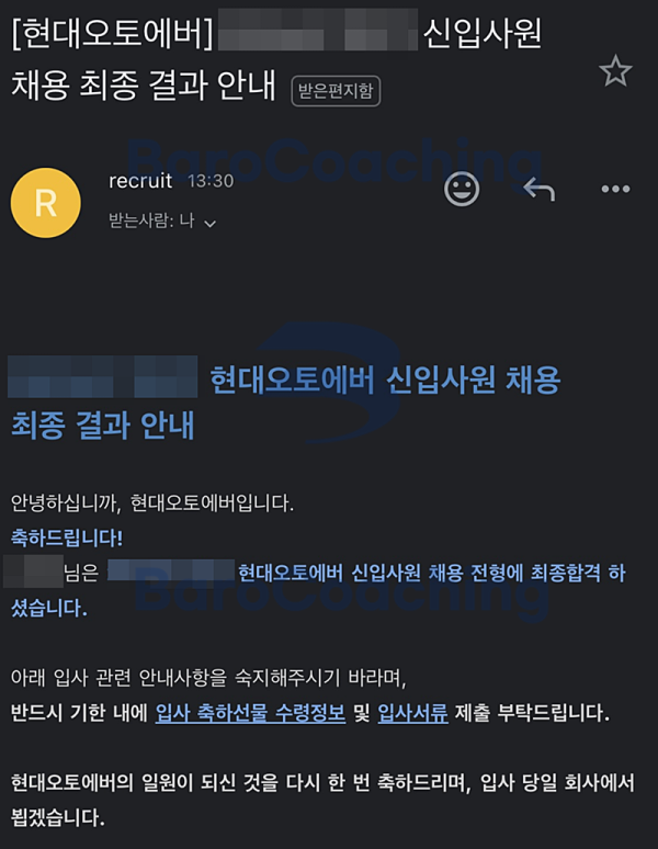 바로코칭에서 컨설팅 받은 학생의 현대오토에버 면접 합격 후기입니다.