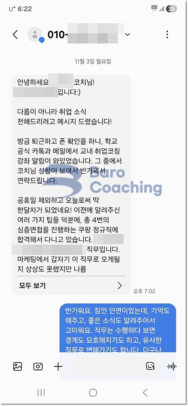 바로코칭을 통해 합격한 수강생들의 실제 문자/카톡 후기를 모았습니다.