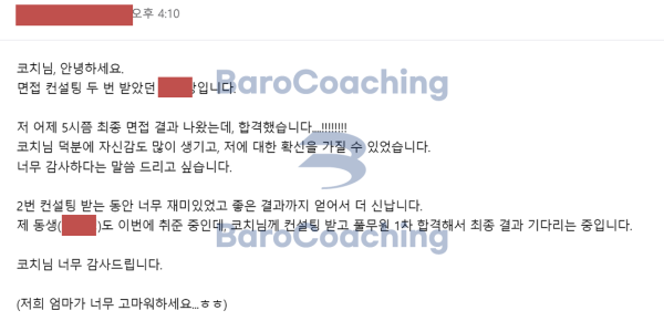 바로코칭을 통해 합격한 수강생들의 실제 문자/카톡 후기를 모았습니다.