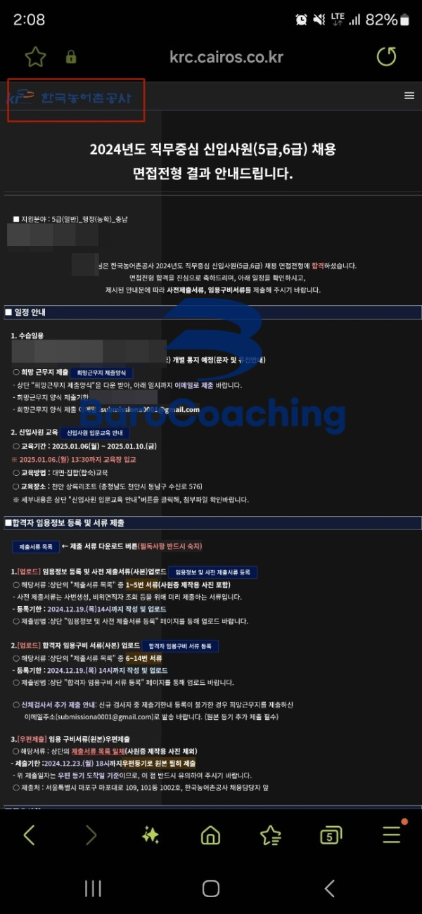 바로코칭에서 컨설팅 받은 학생의 한국농어촌공사 면접 합격 후기입니다.