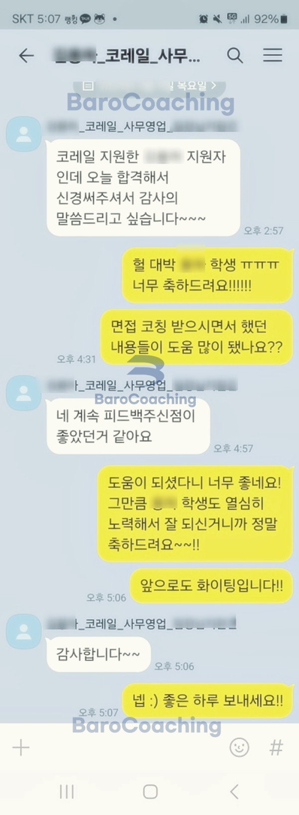 바로코칭을 통해 합격한 수강생들의 실제 문자/카톡 후기를 모았습니다.