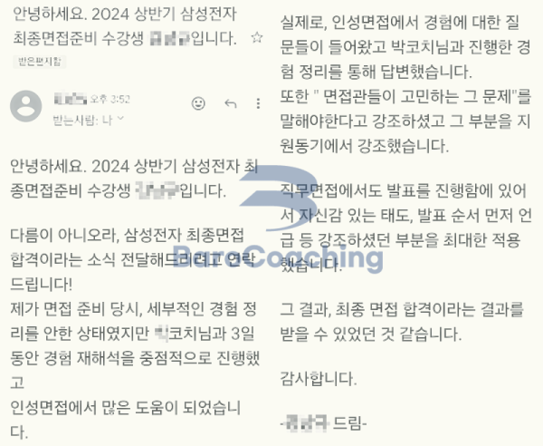 바로코칭에서 컨설팅 받은 학생의 삼성전자 면접 합격 후기입니다.