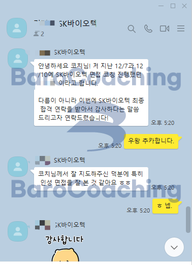 바로코칭에서 컨설팅 받은 학생의 SK바이오텍 면접 합격 후기입니다.