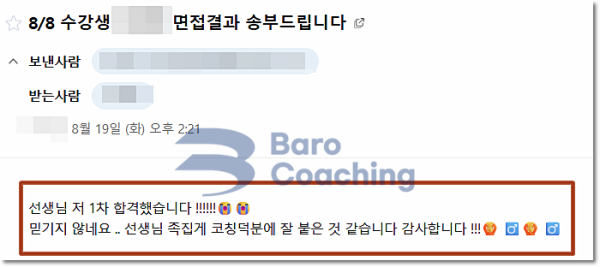 바로코칭을 통해 합격한 수강생들의 실제 문자/카톡 후기를 모았습니다.